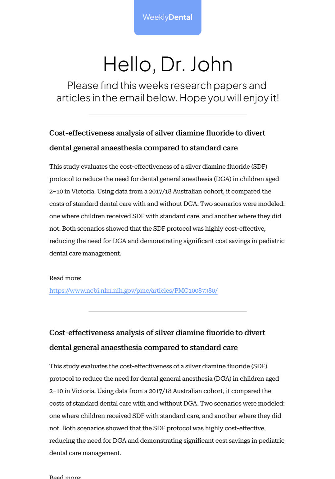 We deliver weekly email newsletter containing concise and to the point information about the most recent public dental research papers, custom tailored for your expertise and preferences based on your profile & biography.